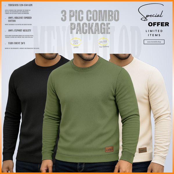 𝐒𝐨𝐥𝐢𝐝 𝐒𝐰𝐞𝐚𝐭𝐬𝐡𝐢𝐫𝐭 _𝐅𝐫𝐞𝐞 𝐃𝐞𝐥𝐢𝐯𝐞𝐫𝐲_ 3 pic Combo Offer 320+ GSM Rib 2/2 Fabric – Olive – Black – Cream